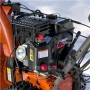 Connect to a power outlet and start the engine by pressing a button. When the engine is warm, it's easy to get going with the starter handle.